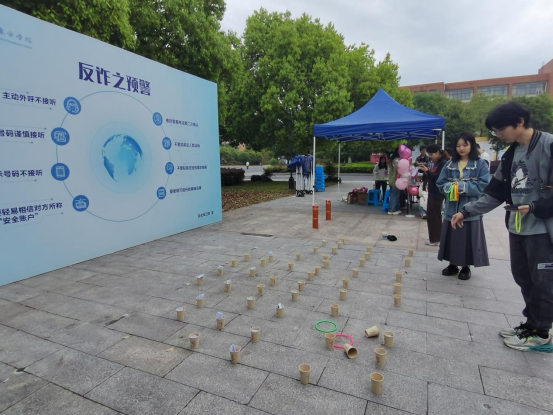 为进一步扩大反诈宣传的覆盖面和宣传效果,营造人人知晓、人人参与的全员反诈氛围,伟德国际victor·1946源自联合安全保卫部在小广场组织了“反诈跳跳跳”和“反诈套圈圈”趣味小游戏,力争做到“寓教于乐”,在潜移默化中提高学生的反诈意识。