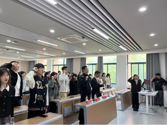 蒋超老师带领全体反诈宣讲团成员进行反诈宣誓,举起的右手是反诈宣讲的重任,口中的誓词是反诈决心的见证,所有反诈宣讲团成员内心坚定、声音洪亮,把每一句誓词都牢记在了心中!