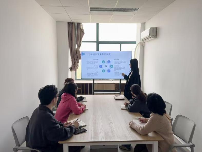 分享会上,辅导员苏钧伟结合此次培训的重点,介绍了大学生常见的心理危机类型、高校心理危机分级标准,通过举例说明如何用 “行为观察清单”识别学生隐性心理问题;同时分享了培训获得的 危机事件应急处置流程图、大学生网络心理危机识别手册等实用资料,还现场演示了“非暴力沟通”“情绪疏导五步法”等简单易操作的干预技巧。