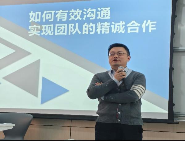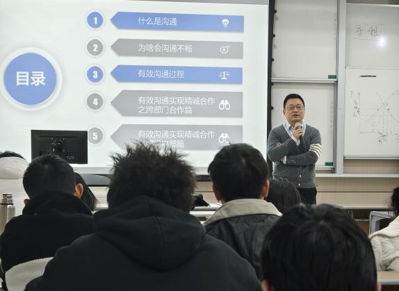 龙璇行长从“什么是沟通”“为什么会沟通不畅”“有效沟通的过程”“有效沟通实现精诚合作之跨部门合作篇”“有效沟通实现精诚合作之部门内部篇”五方面展开此次讲座。讲座开始,龙璇行长用问答的方式询问同学们“什么是沟通”,以此来引出演讲内容。深耕职场多年,龙璇行长对于职场沟通有着丰富的技巧与心得,指出沟通在职场中具有重要意义,不仅影响团队的合作效率,也对工作氛围和自身职业发展有着重要影响。随后,他以自身为例,与同学们分享自己与身边人沟通的方式以及如何通过自己的沟通方式来拉进自己与他人的距离,增加信任感。