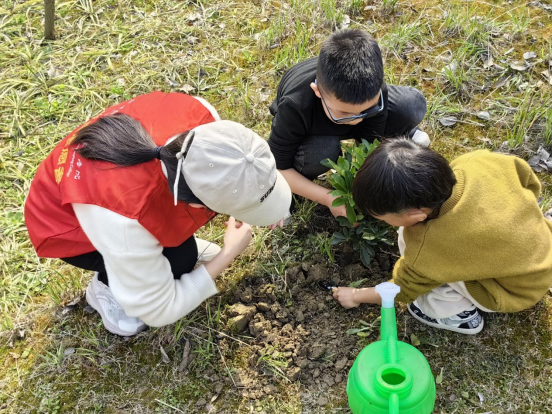 随后,学生党员志愿者带领小朋友植树增绿,分工协作、配合默契,有条不紊地开展植树工作,挥锹铲土、扶苗填坑、提水浇灌……大家热情高涨,齐心协力,栽下了一株株树苗。学生党员和入党积极分子们用实际行动践行“绿水青山就是金山银山”的生态理念,传播了生态文明新风尚。
