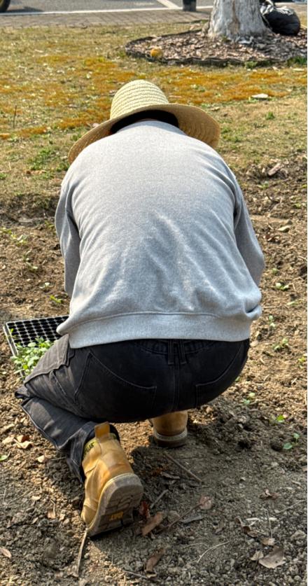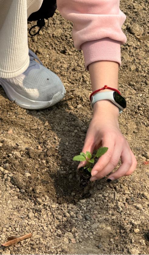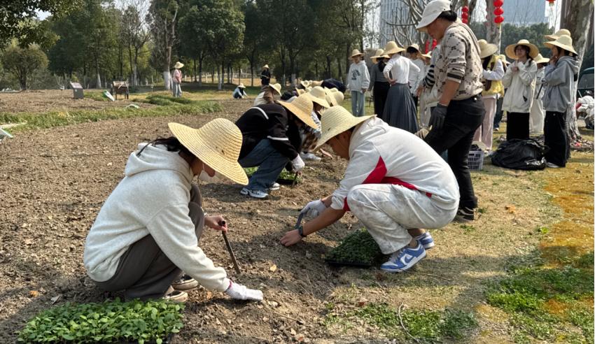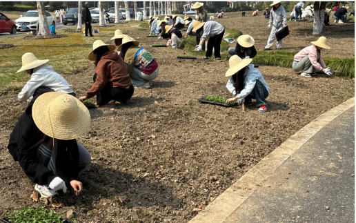 松土、挖坑、扶苗、培土、浇水……大家分工协作,动作从生涩到熟练,汗水浸湿了衣衫,泥土沾满了双手,但欢声笑语始终萦绕在田间。经过数小时的辛勤劳作,数百株马鞭草幼苗整齐地扎根土壤,原本空旷的土地瞬间被新绿点缀,焕发出勃勃生机。