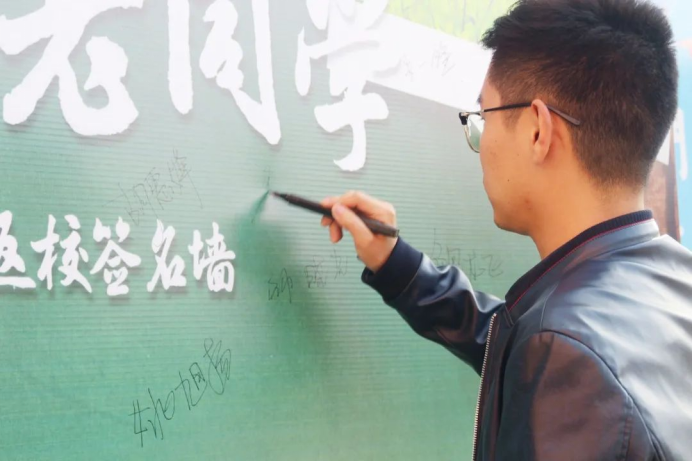 下午两点一刻,学院师生为校友们准备了一系列的活动。青春不散场,芳华更绽放。教学楼前,校友们纷纷在墙上签名并且合影留念。