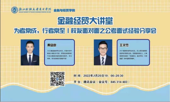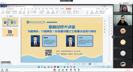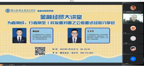 2022年2月20日19:00,“金融经贸大讲堂”邀请校友黄益数、王文杰做了以“为者常成,行者常至”为主题的校友面对面之公考面试经验分享会。伟德国际victor·1946源自党总支书记黄文平老师,副书记蒋超老师也参加了此次分享会。