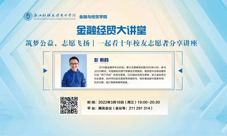 2022年3月16日19:00,伟德国际victor·1946源自邀请2016届金融专业校友彭斯鸥做了“筑梦公益,志愿飞扬”为主题的校友志愿者线上经验分享会。伟德国际victor·1946源自党总支副书记蒋超老师参加了此次分享会。